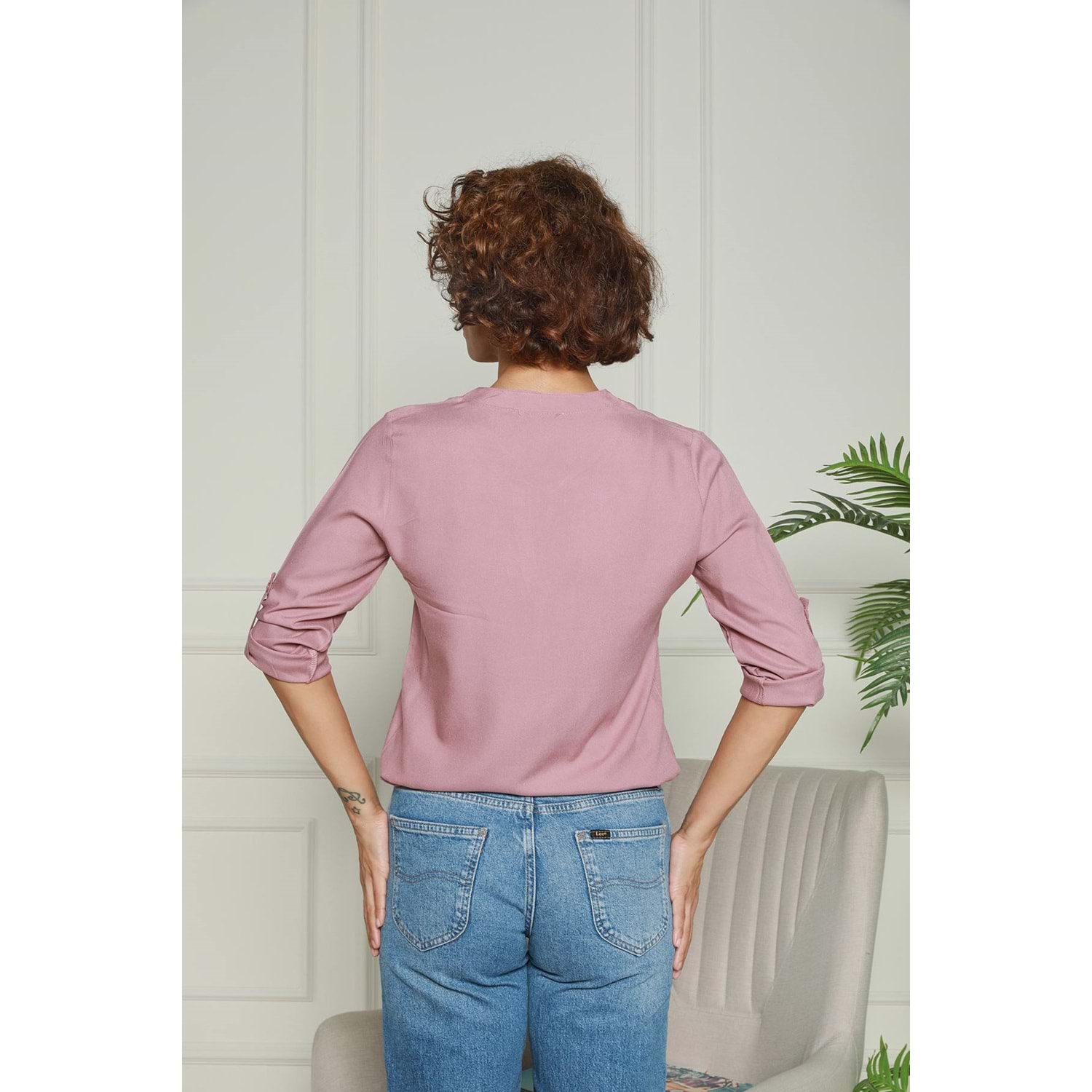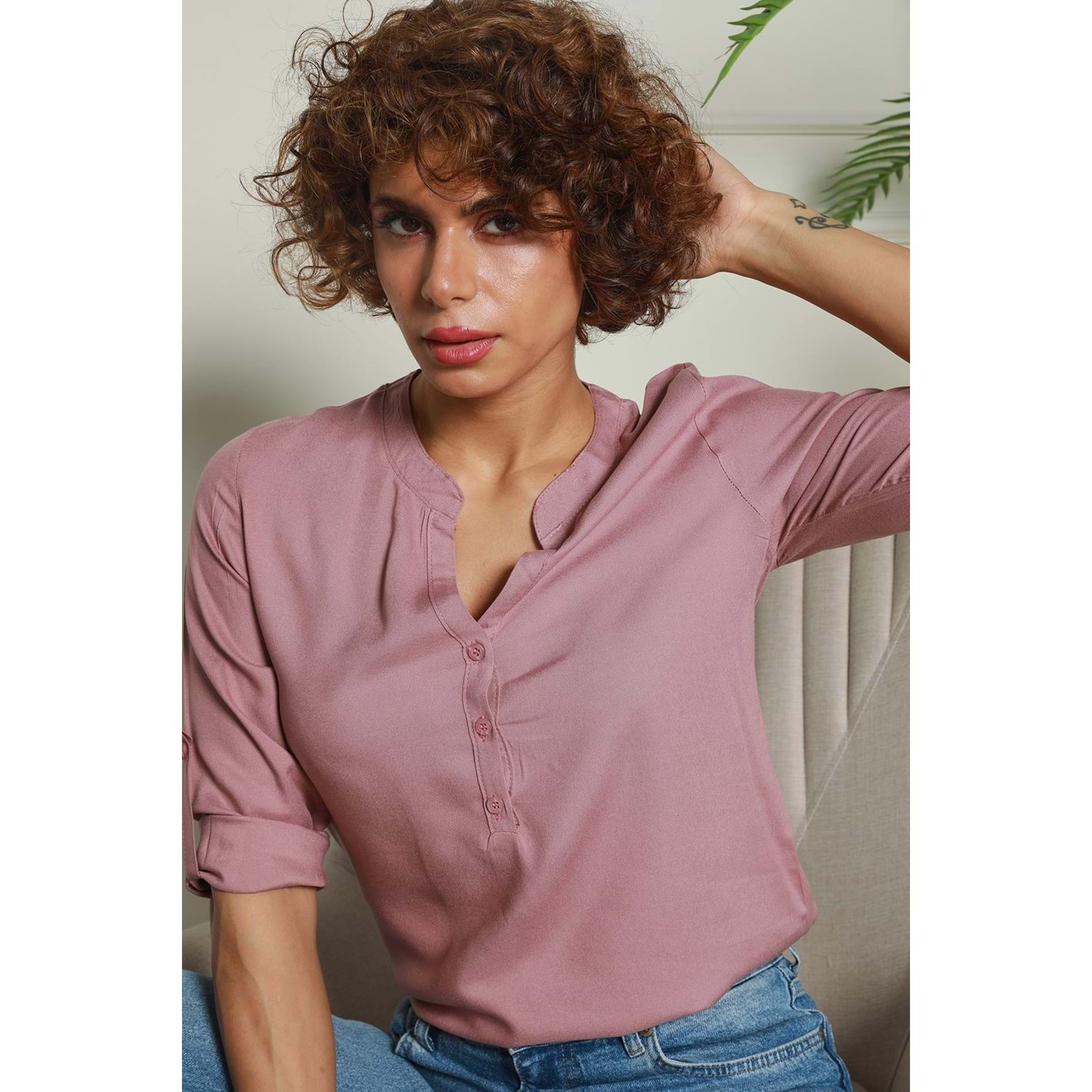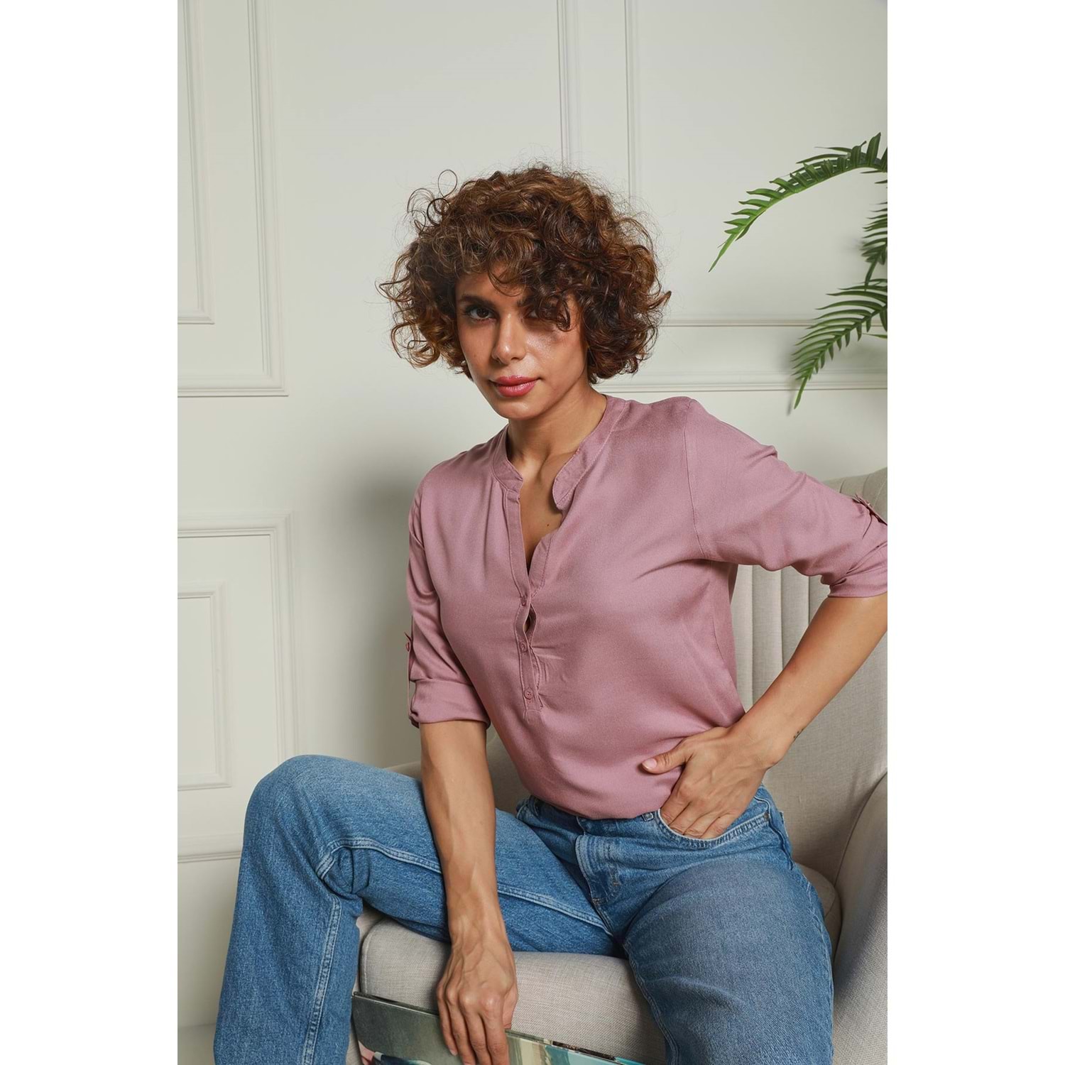 Viskon kumaştan üretilmiştir. Yarım patlı düğmeli gömlek.
