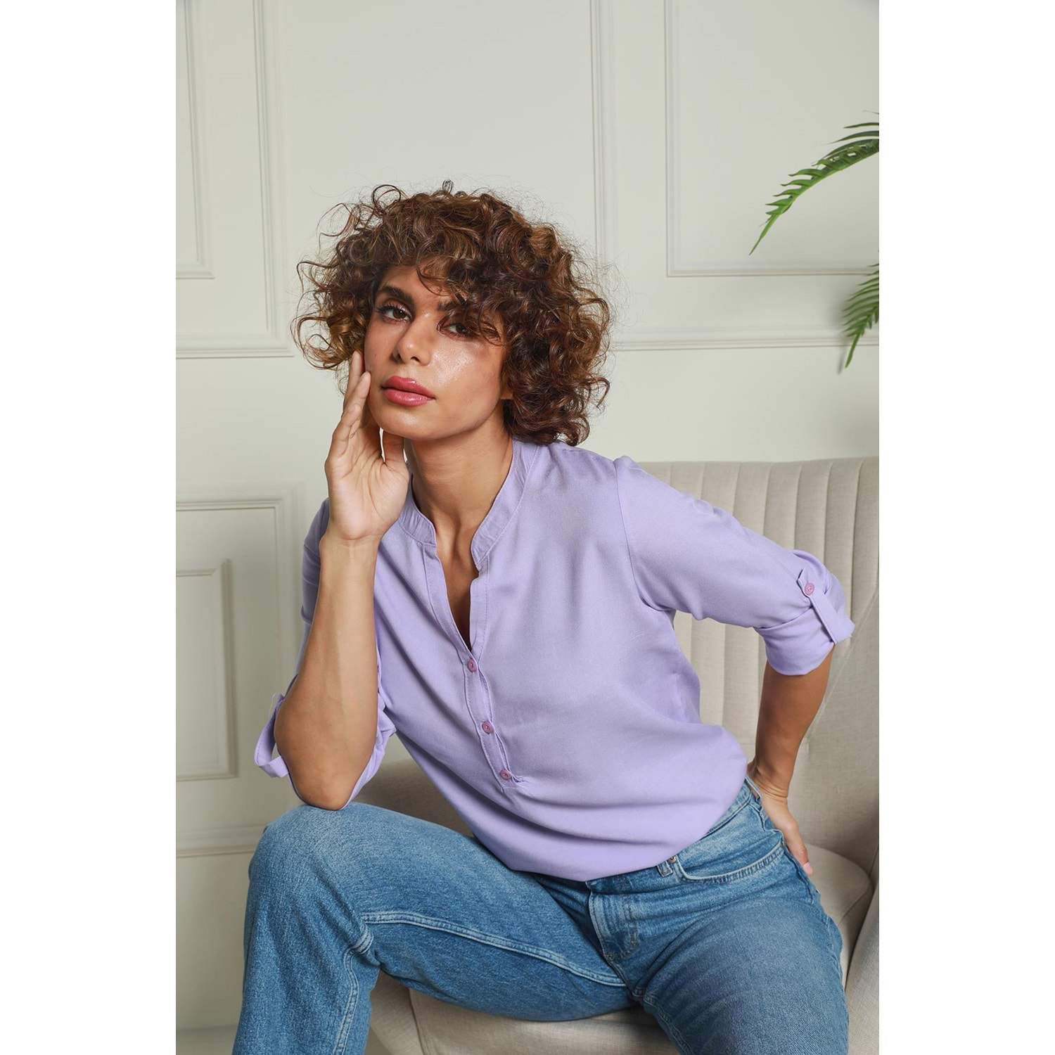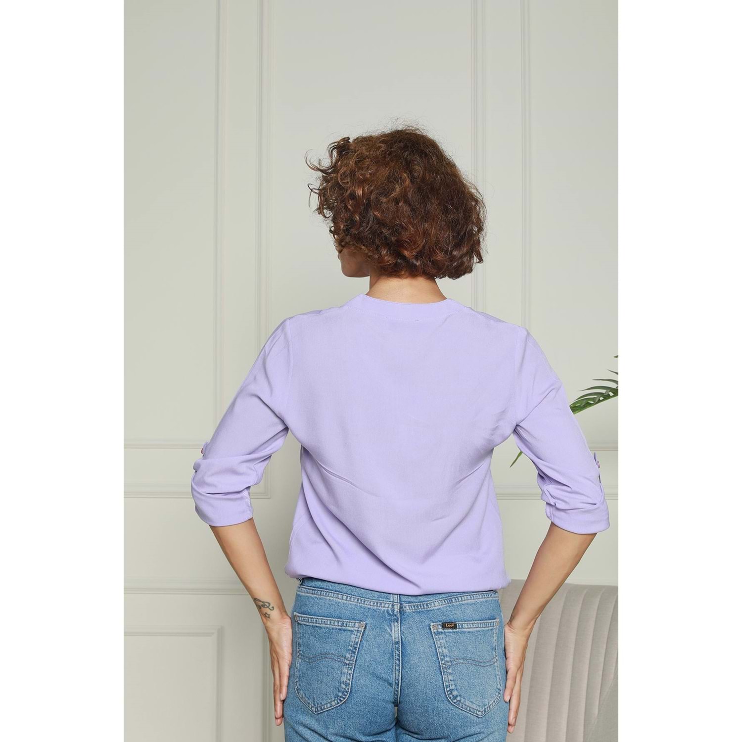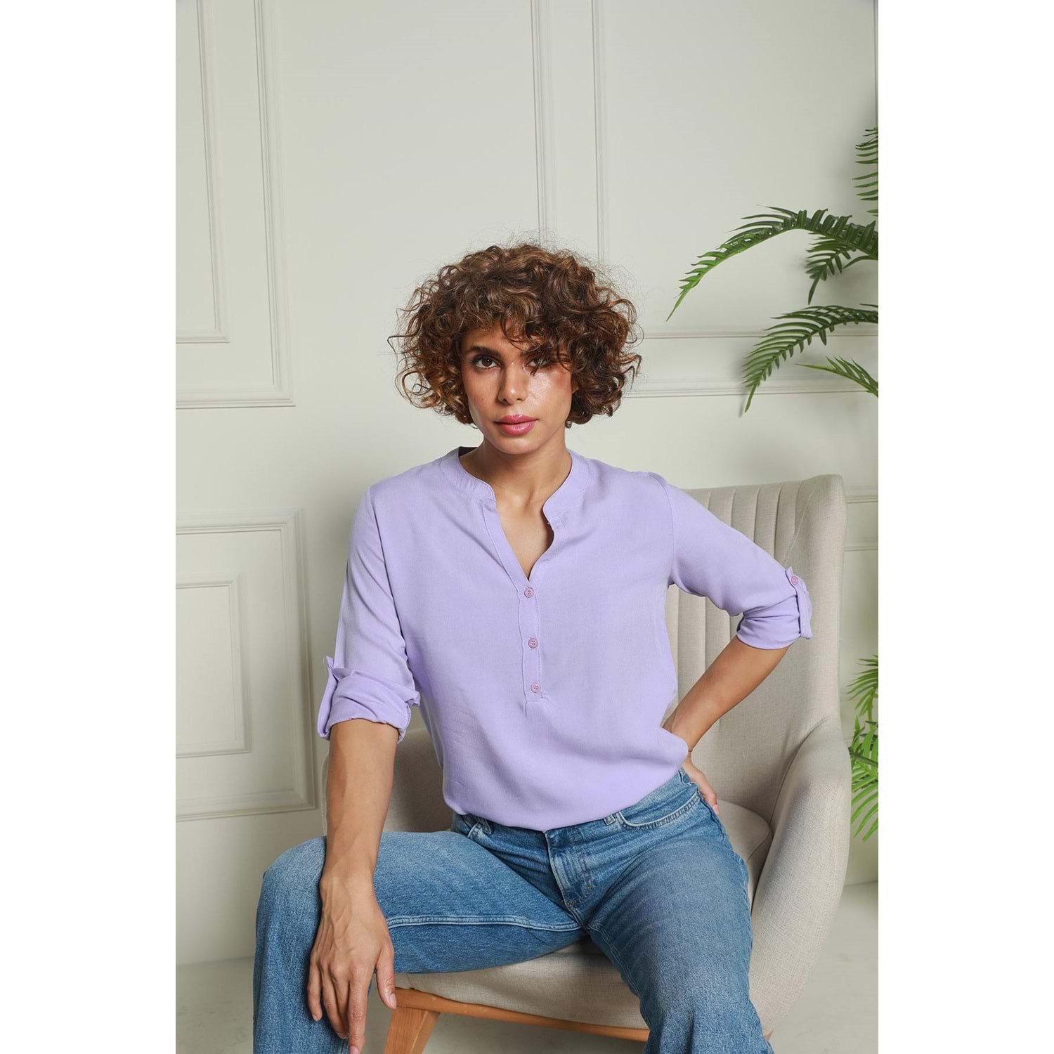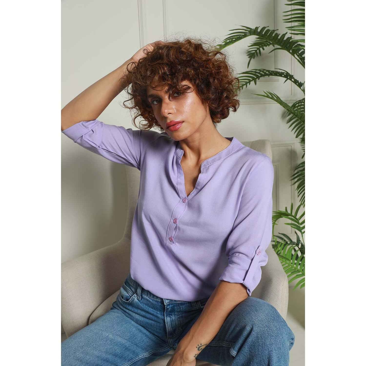 Lila Hakim Yaka Yarım Patlı Viskon Gömlek 1500064